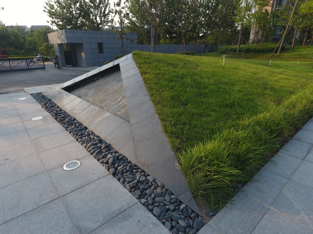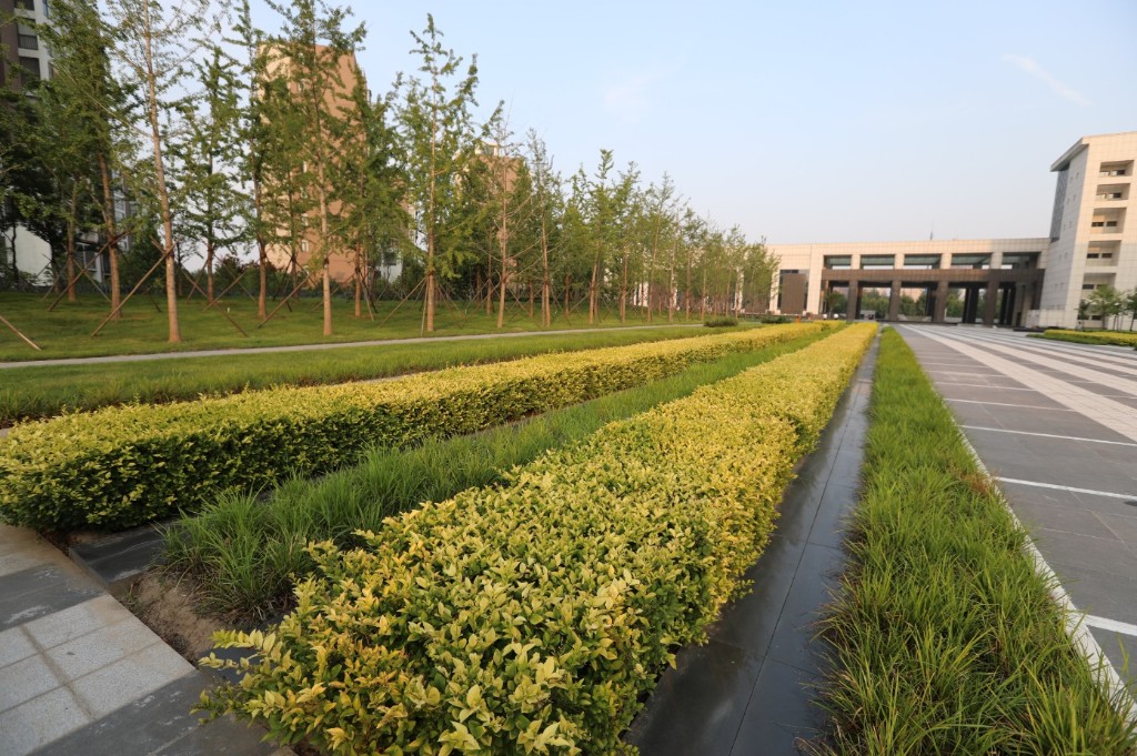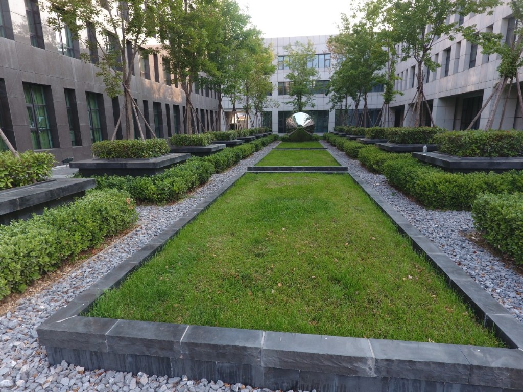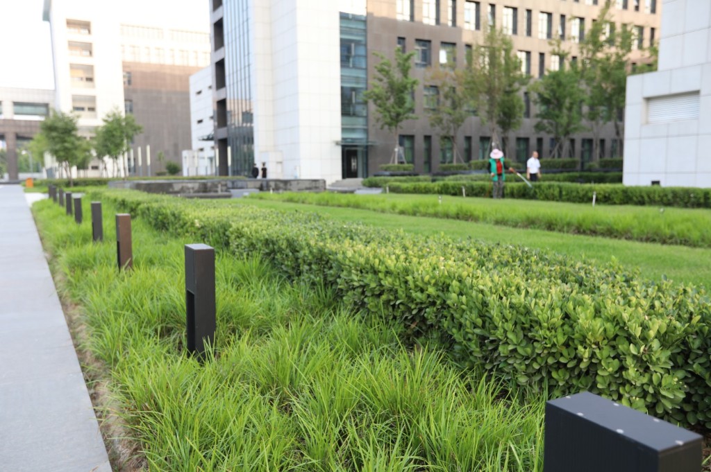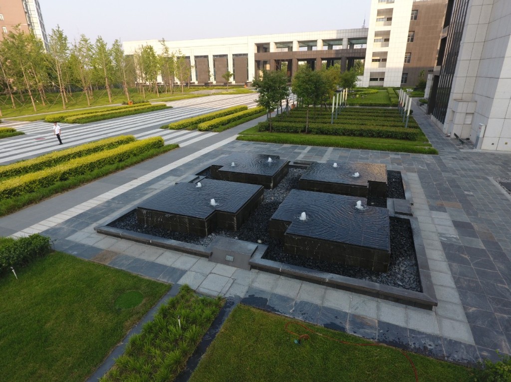 場地采用幾何式的線條設(shè)計,利用植物、水景等景觀元素劃分出不同的功能空間,簡潔明快,充滿現(xiàn)代氣息。道路結(jié)合植物做到人車分流,保障行人的安全。將商務(wù)區(qū)與其他樓連接在一起,創(chuàng)造出令人舒適的小尺度空間,鞏固了人與人之間的親密感受。大小空間的連接處由水景作為過渡,形成視覺焦點,豐富空間層次。