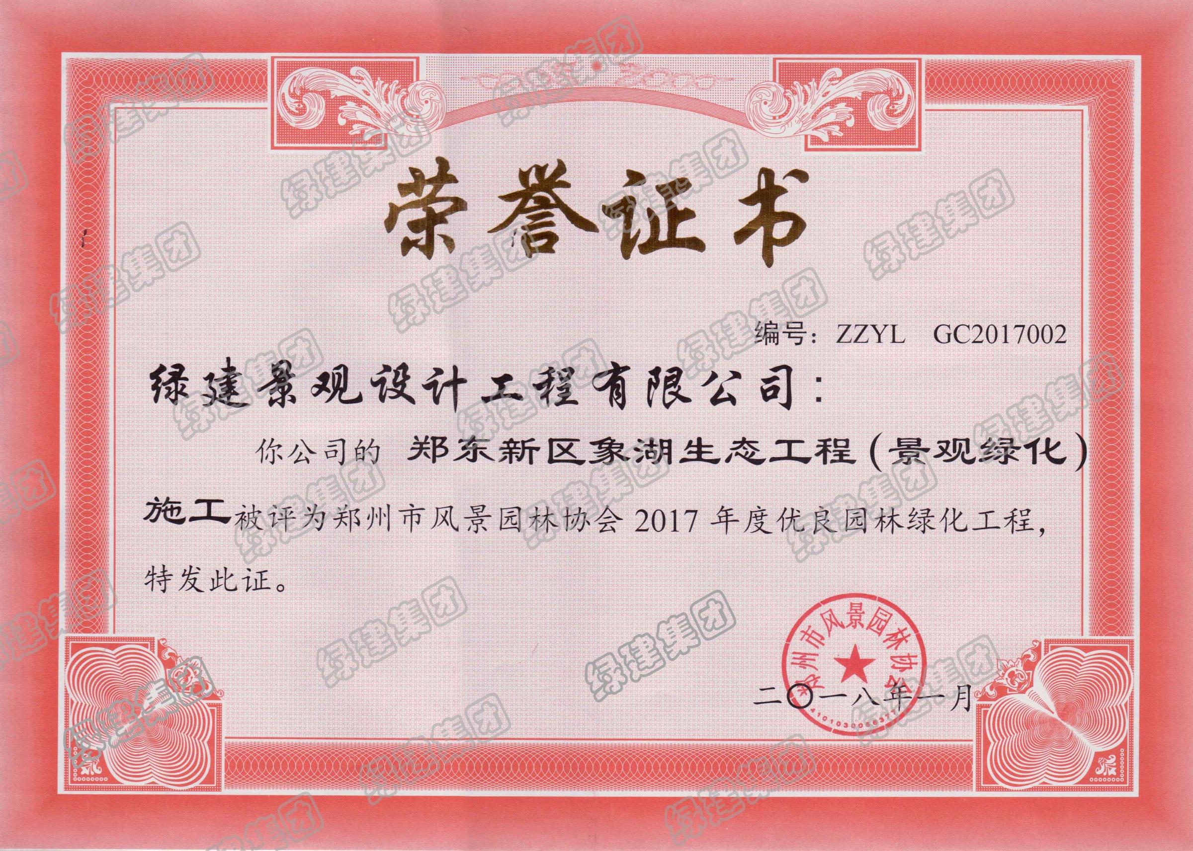 鄭東新區象湖榮獲鄭州市風景園林協會2017年度優良園林綠化工程