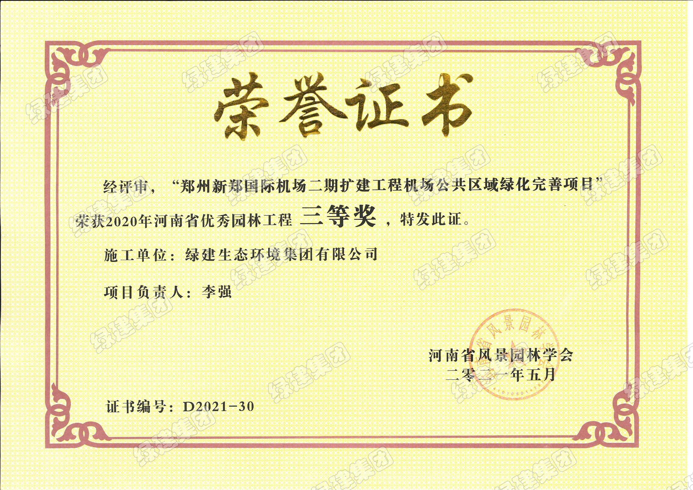 鄭州新鄭國際機場二期擴建工程機場公共區域綠化完善項目——2020年河南省優秀園林工程三等獎